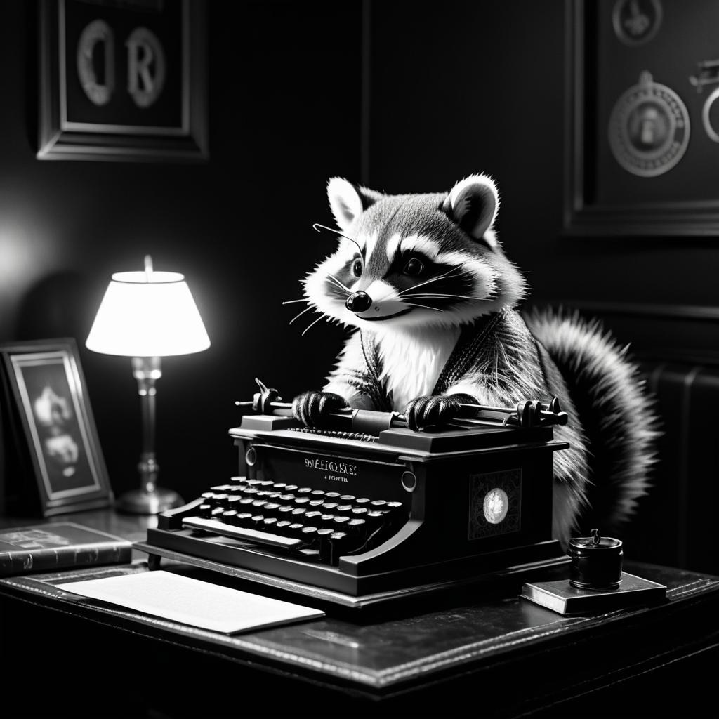 Noir Raccoon Writing at Typewriter