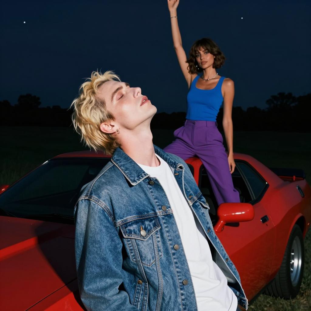 A night scene. Foreground: man with pale skin, short blonde hair, blue denim jacket, white shirt, head tilted back, eyes closed. Background: woman with tan skin, short brown hair, purple pants, blue tank top, standing on red muscle car, arm raised. Car on grass, dark sky with stars. Man in front, woman behind car.