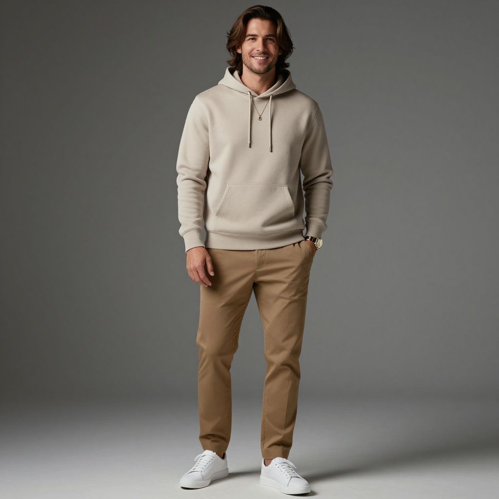 A stylish man in his early 30s, with medium-length brown hair and a confident smile, wearing a beige hoodie and tan pants. He has a delicate necklace around his neck, a prominent watch on his left wrist, and fresh white sneakers on his feet. Full body shot, cinematic lighting, fashion photography style.