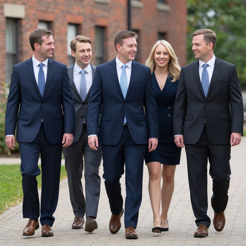 Photograph of three Caucasian men with short brown hair, wearing black suits, white dress shirts, and different colored ties (blue, white, and maroon). They are walking on a paved path with a blurred background of a red brick building and green grass. All three men are smiling and looking at each other, exuding a friendly and professional demeanor. They are wearing brown leather dress shoes and are positioned side by side, with the man on the left slightly ahead. The image has a bright, natural light setting.