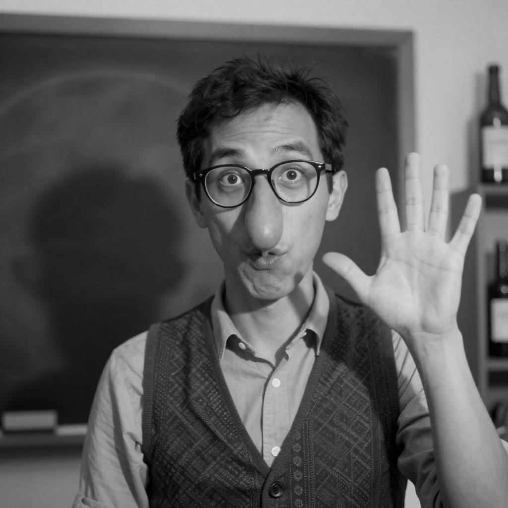 Black and white photograph of a caricature-like man with exaggerated facial features, large nose, and pointed ears. He wears glasses, a patterned vest, and raised his right hand with fingers spread wide. Background includes a shadowed chalkboard and shelf with bottles. His intense expression is directed towards the camera.