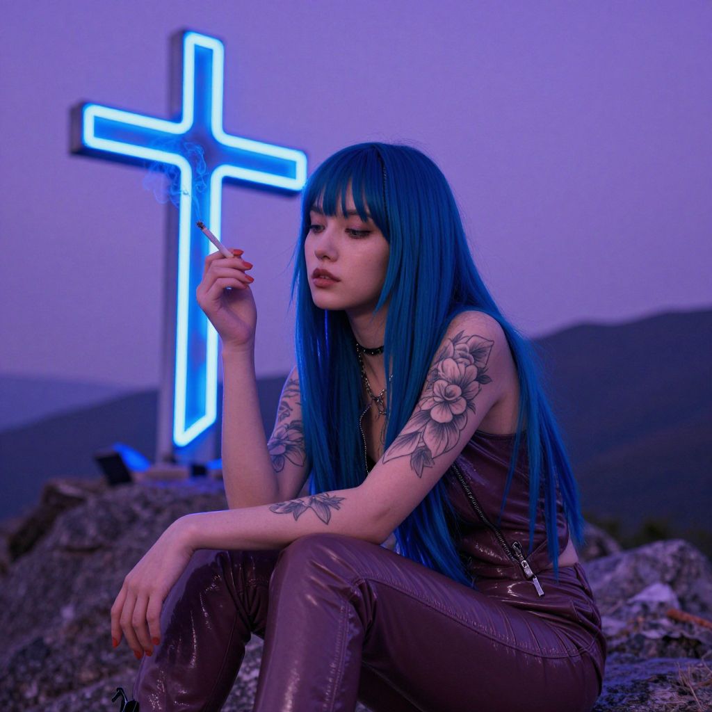 Youthful, cozy, natural skin, photoreal, wearing a leather jacket and tight vinyl pants, cinematic shot from a low angle masterpiece 30mm A close-up, macro shot portrait extreme realistic depiction of a young japan woman with long, straight, vibrant blue hair styled with blunt bangs, pale skin, blue eyes, and delicate floral beautiful tattoos on her arms, a woman sits contemplatively on a rocky outcrop, a large, weathered neon-vibrant blue cross at dusk, her is positioned slightly left of center, facing forward, but with a pensive expression, looking downward, and there's a wisp of vibrant blue smoke rising from his cigarette hand, leading to a backdrop of purple-toned mountains, The overall color palette is vibrant purple and violet, with touches of vibrant blue neon, creating a dramatic and slightly surreal atmosphere, The lighting is dramatic, highlighting the woman and the neon signs against the dark purplish-violet background, The image is styled with a muted color palette, The image has a slightly desaturated, moody aesthetic, with soft lighting and a slightly blurry background, The overall aesthetic is ethereal and slightly melancholic yet intimate, reminiscent of fine art photography, cinematic lighting, cinematic, film grain, The style is reminiscent of Japanese fashion photography, soft natural lighting, dynamic angle, Interested, expression, style of Light painting, aidmaglow