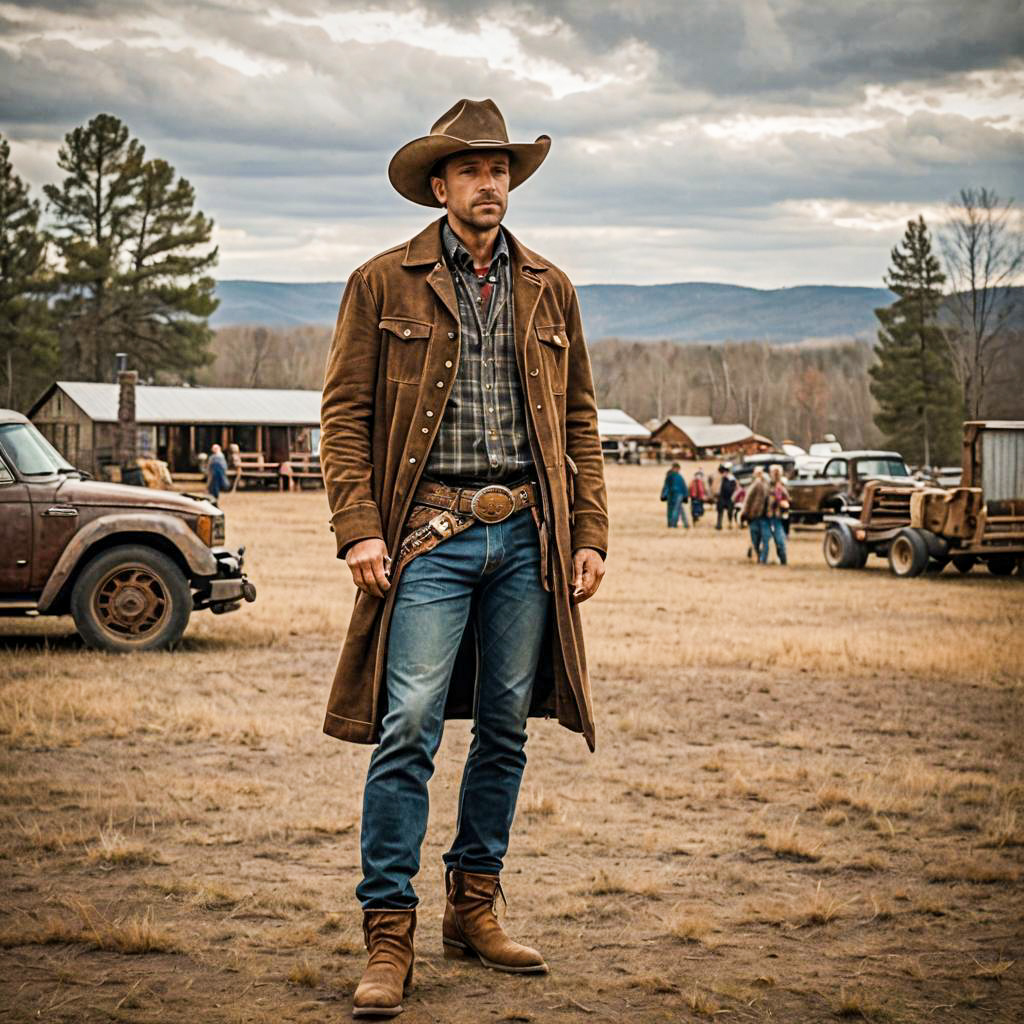 Photo of a Broad Back man, Mohawk, ken cowboy outfit, cowboy hat, suede jacket, plaid shirt, leather boots, skinny jeans, western belt, rustic, rugged, classic cowboy style, Fossil Gray earthy tones, casual, masculine, Country Fair, impressionist painting