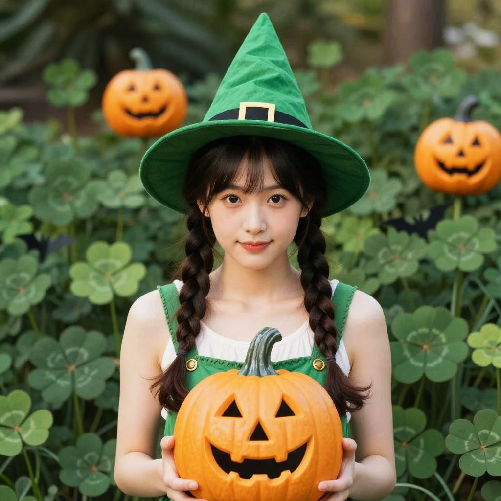 Young Asian girl with braided hair wearing a green witch hat and matching green overalls, holding a carved jack-o'-lantern pumpkin, standing in a garden filled with green clover plants and Halloween decorations.