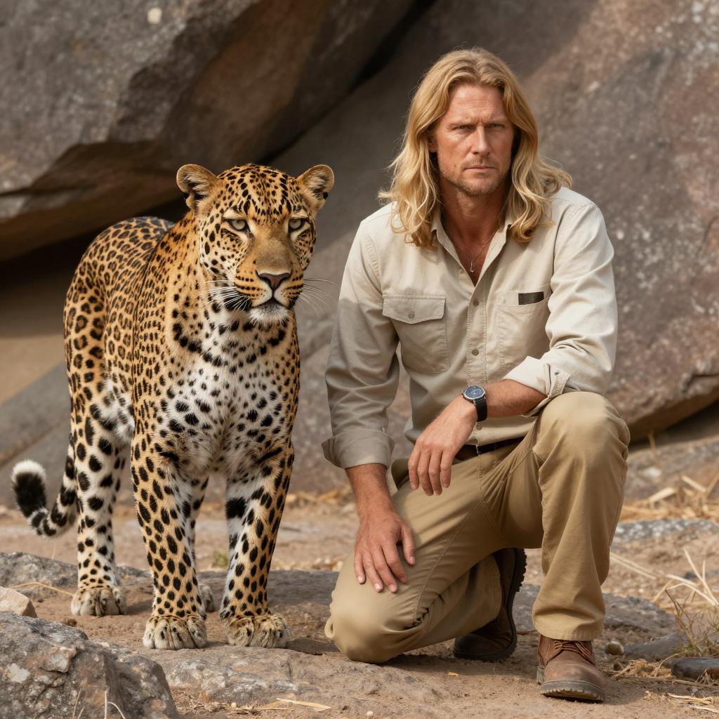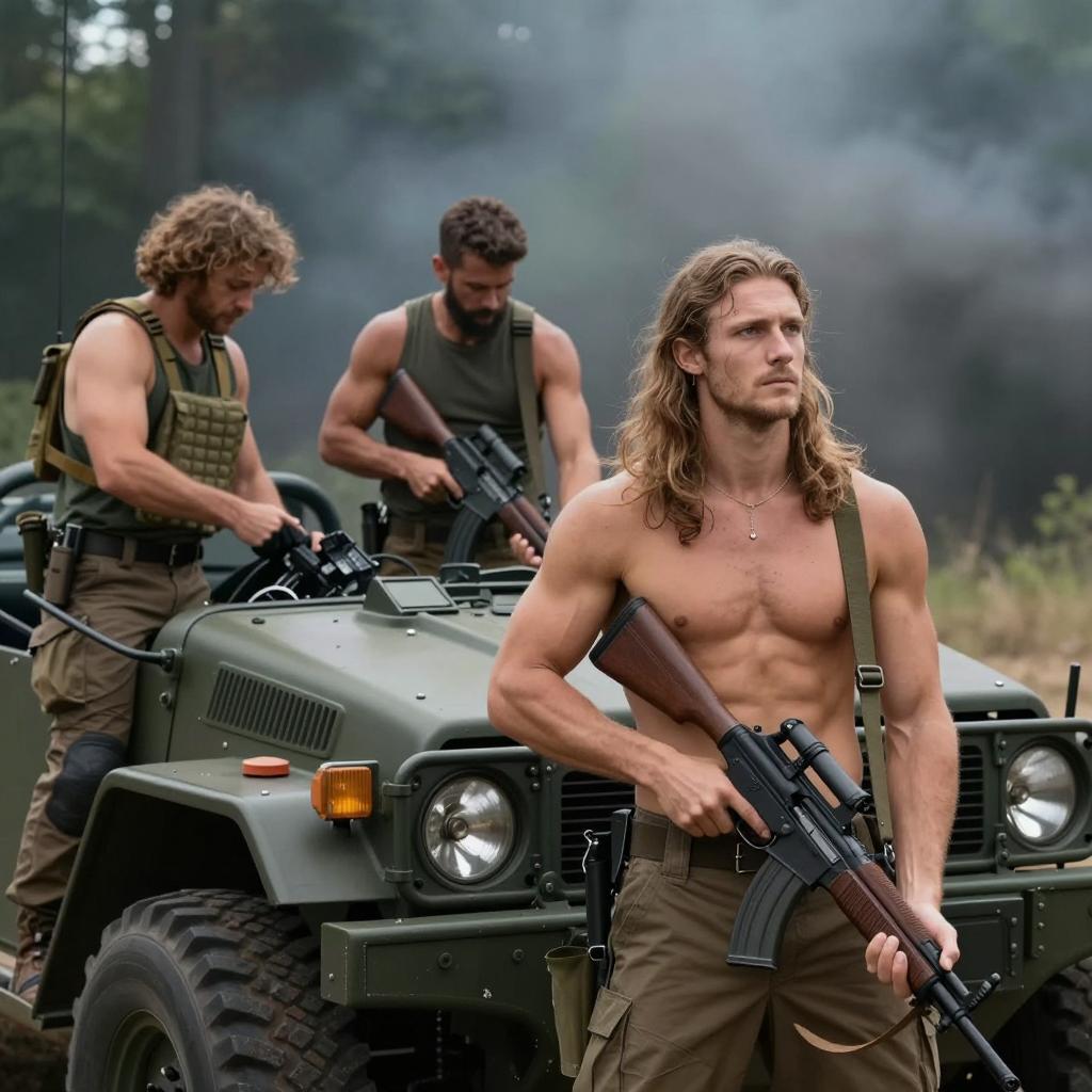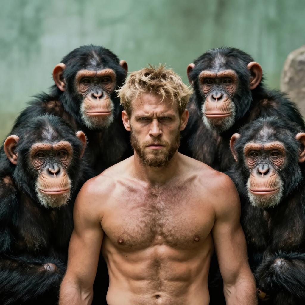 Shirtless man with messy blonde hair and beard, muscular build, intense expression, surrounded by five chimpanzees with human-like faces, standing in front of a green, ured wall. Chimpanzees have serious expressions, one on the left has darker hair. Man's chest and arms have visible hair.
