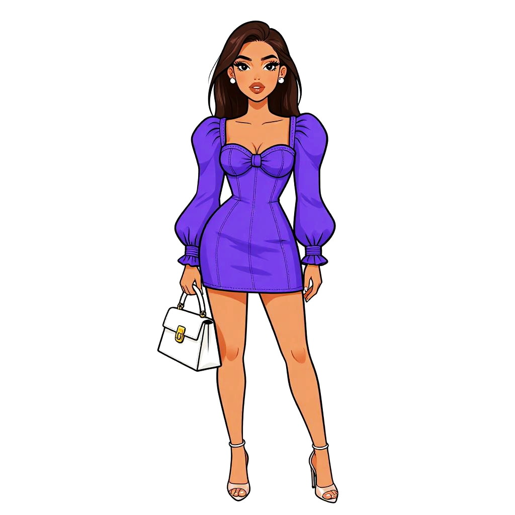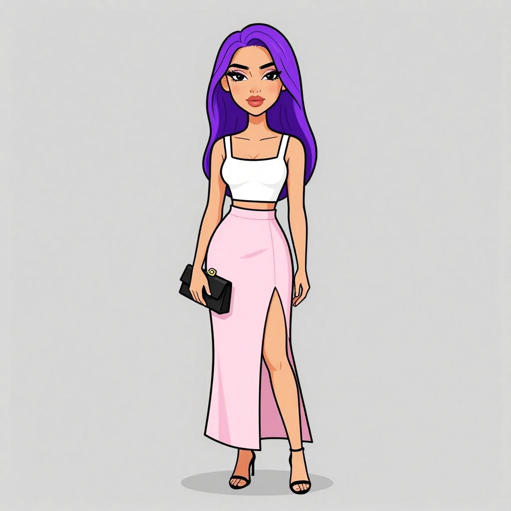 Woman with pretty face and pretty hair. Woman, modern party fashion, metallic magenta crop top with square neckline, sleeveless, matching high-waisted mini skirt, shiny satin-like material, straight-cut hem, holding a purple clutch, white background. --sref 1467
