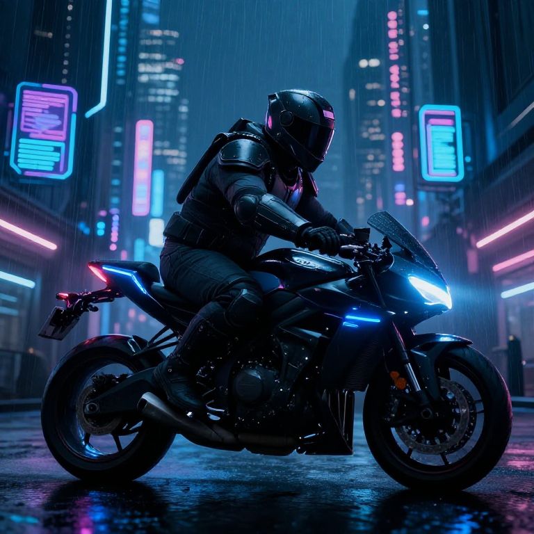 Fat guy riding motorcycle in a futuristic cyberpunk city, neon-lit skyscrapers and holographic signs all around, sleek black motorcycle with glowing blue accents, wearing high-tech armor and helmet, dark and moody atmosphere with rain effects