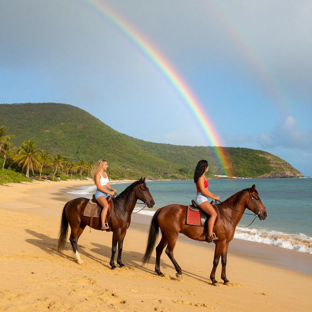 Two women horseback riding along a golden sandy beach in the Caribbean, with a vibrant rainbow arching gracefully above them against a backdrop of lush green hills and turquoise waters.