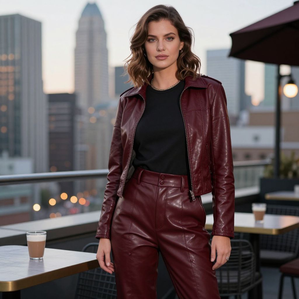 A lifestyle image of a stylish woman in her late 20s with medium-length wavy brown hair and soft blue eyes wearing high-waisted faux leather pants in a rich burgundy tone, paired with a leather jacket, standing confidently at a rooftop coffee shop in a modern city skyline with soft city lights below.