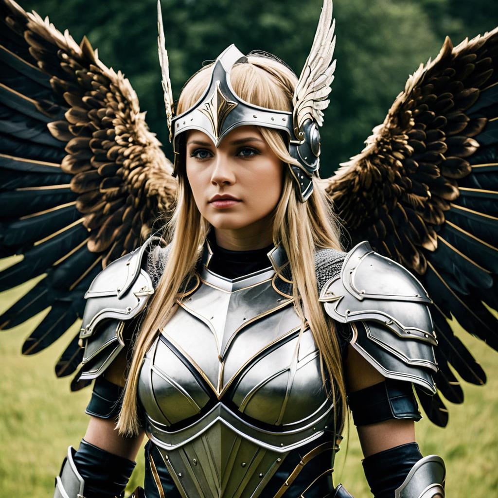 King valkyrie cosplay,1girl, solo, armor, wings, blonde hair, long hair, helmet, breastplate, head wings, shoulder armor