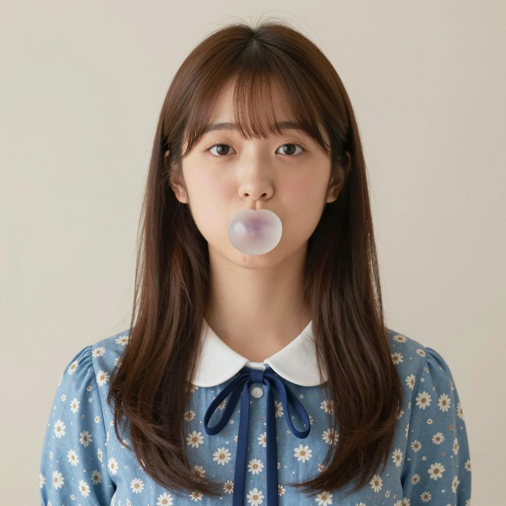 Young Japanese woman with long brown hair and bangs, blowing bubble gum in her mouth. Wearing blue floral dress with white collar and blue bow. Neutral beige background. Centered, head-and-shoulders shot. Soft, natural light. Facial expression: neutral.