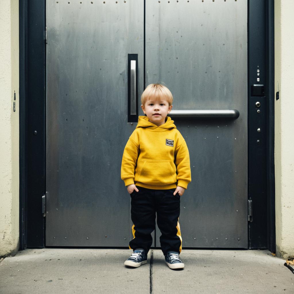 Photograph of a young Caucasian boy standing in front of a large, dark gray, industrial-style metal door. He has light blonde hair and a serious expression. He is wearing a bright yellow hooded sweatshirt with a small black logo on the left chest, black pants with yellow stripes on the sides, and black and white sneakers. The door has a horizontal black handle and is flanked by a white wall on the left. The concrete ground is gray and slightly textured. The image is brightly lit, highlighting the contrast between his yellow sweatshirt and the dark door.