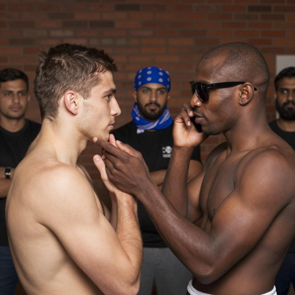 Two shirtless men boxing. The man on the left, with short brown hair and a receding hairline, faces the camera, his right hand resting on his cheek. The man on the right, with a shaved head, wears sunglasses and holds a phone to his ear. Three other men, one in a blue patterned headscarf, stand in the background. The setting is an indoor brick-walled area. The man on the right touches the other man's chin with his left hand.