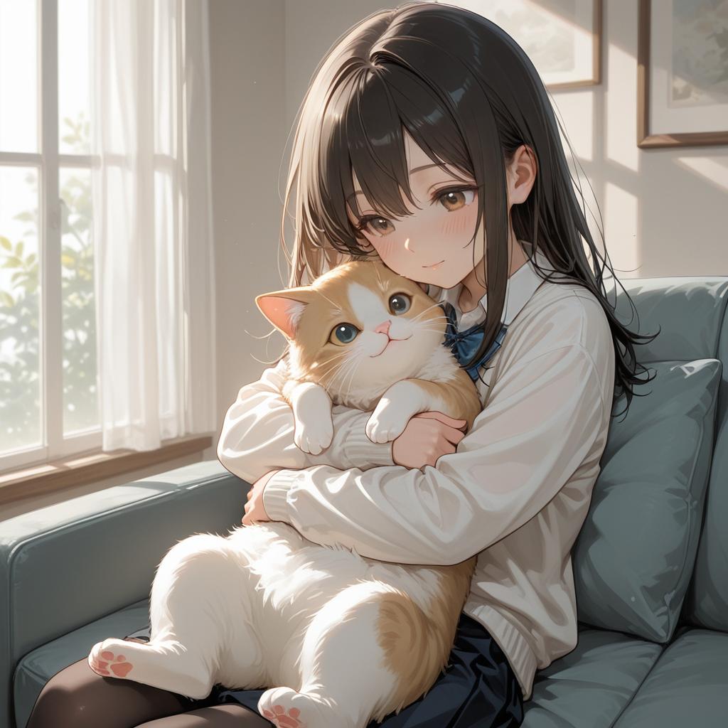 (best quality, masterpiece), 1girl, hug cat, happy