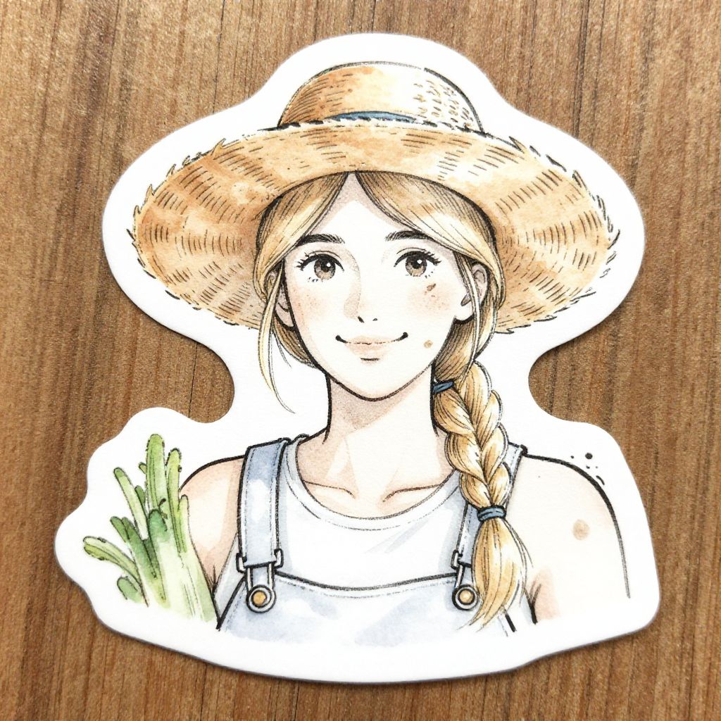 Pencil And Watercolor Drawing sticker style line art of the head and shoulders of a dirty 30 something woman blonde farmer wearing a straw hat, overalls, vegetables, smirking,