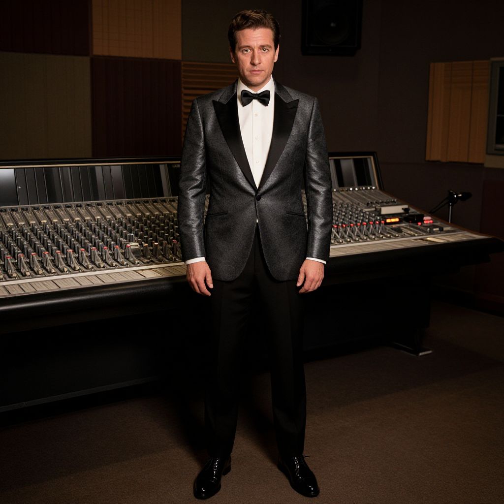 Photograph of a Caucasian man with short dark hair, standing in front of a large mixing console in a dimly lit recording studio. He is wearing a black satin tuxedo with a white dress shirt and black bow tie, paired with black dress shoes. The mixing console behind him is filled with numerous knobs and buttons, and there are soundproofing panels on the walls. The man's expression is serious, and he stands with his hands by his sides. The lighting emphasizes his formal attire, creating a contrast with the darker, more subdued background.