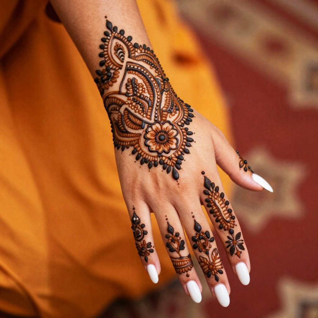 A close-up photo of a hand with intricate black henna designs covering it. The henna features floral patterns and paisley shapes. The nails are long and white. The background is blurred with warm orange and red hues, creating a contrast with the dark henna. The hand is positioned horizontally, palm up, and the focus is on the detailed artwork.