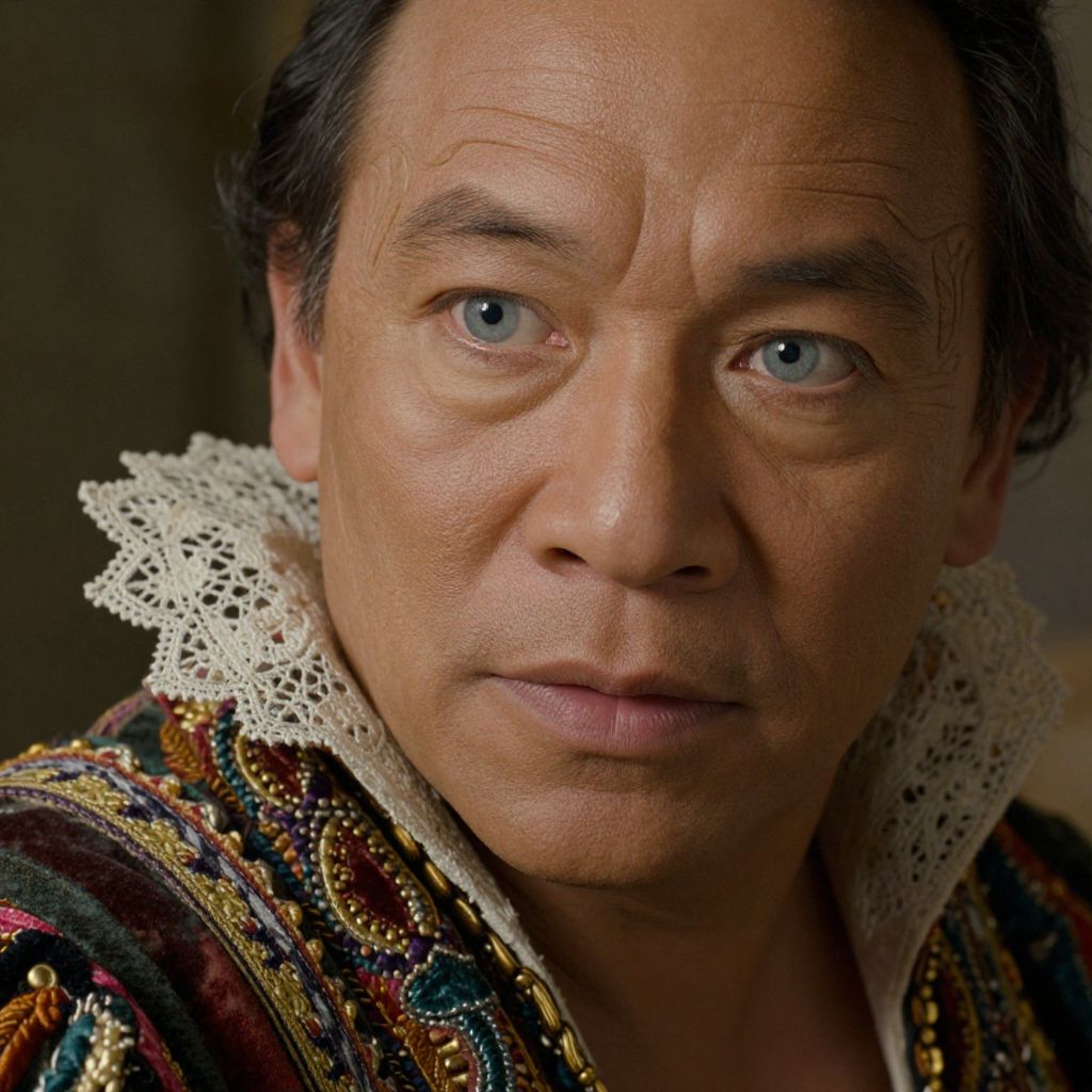 Photograph of an older Asian man with fair skin, thinning dark hair, and light blue eyes, wearing an elaborate, multicolored embroidered garment with intricate patterns. He has a serious expression and is adorned with a large white lace collar. The background is blurred, focusing attention on his face. The lighting highlights the texture of his skin and the details of his attire, creating a rich, textured visual contrast. The image is highly detailed and captures the man's contemplative gaze directly at the camera.