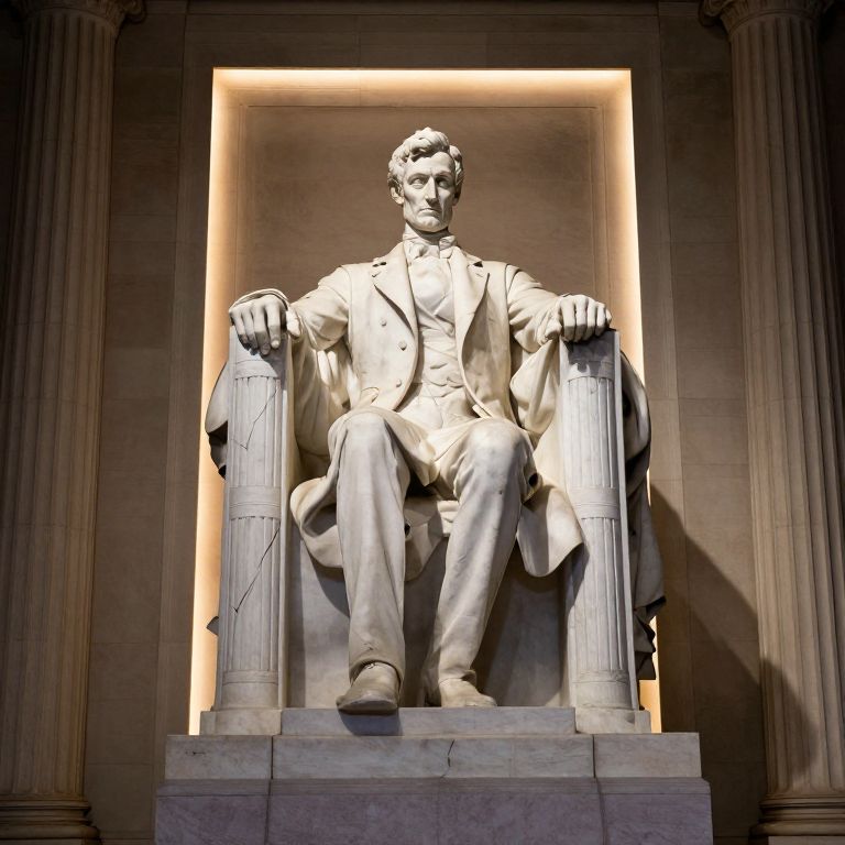 The image depicts a grand, illuminated stone monument, likely representing a significant figure or event in American history. The statue, carved from a single block of stone, sits within a rectangular frame that appears to be part of a larger structure. The figure is depicted in a classical pose, with one hand resting on a column and the other extended outward, as if addressing a crowd. The stone is meticulously detailed, with visible cracks and textures that add to its realism. The monument is bathed in a soft, glowing light that highlights its contours and creates a sense of depth. The background features tall, dark columns that frame the monument, enhancing its prominence. The overall composition is balanced, with the statue centrally positioned and the glowing edges adding a modern touch to the otherwise classical design.