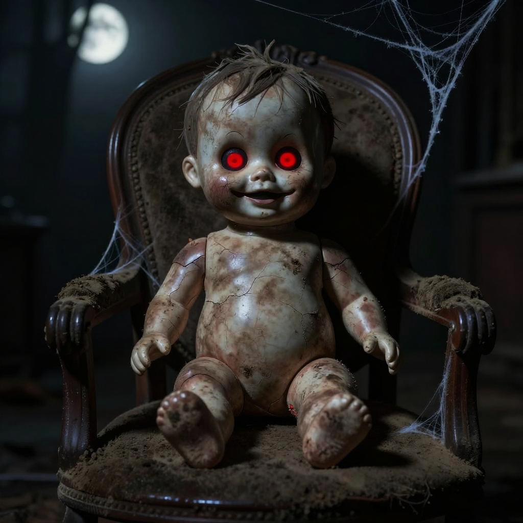 Creepy uncanny images portraying an old dollhouse with miniature figures frozen in strange poses, cracked porcelain faces with unsettling grins, dim light casting long shadows, the scene feeling both nostalgic and terrifying with hyper-realistic detail.