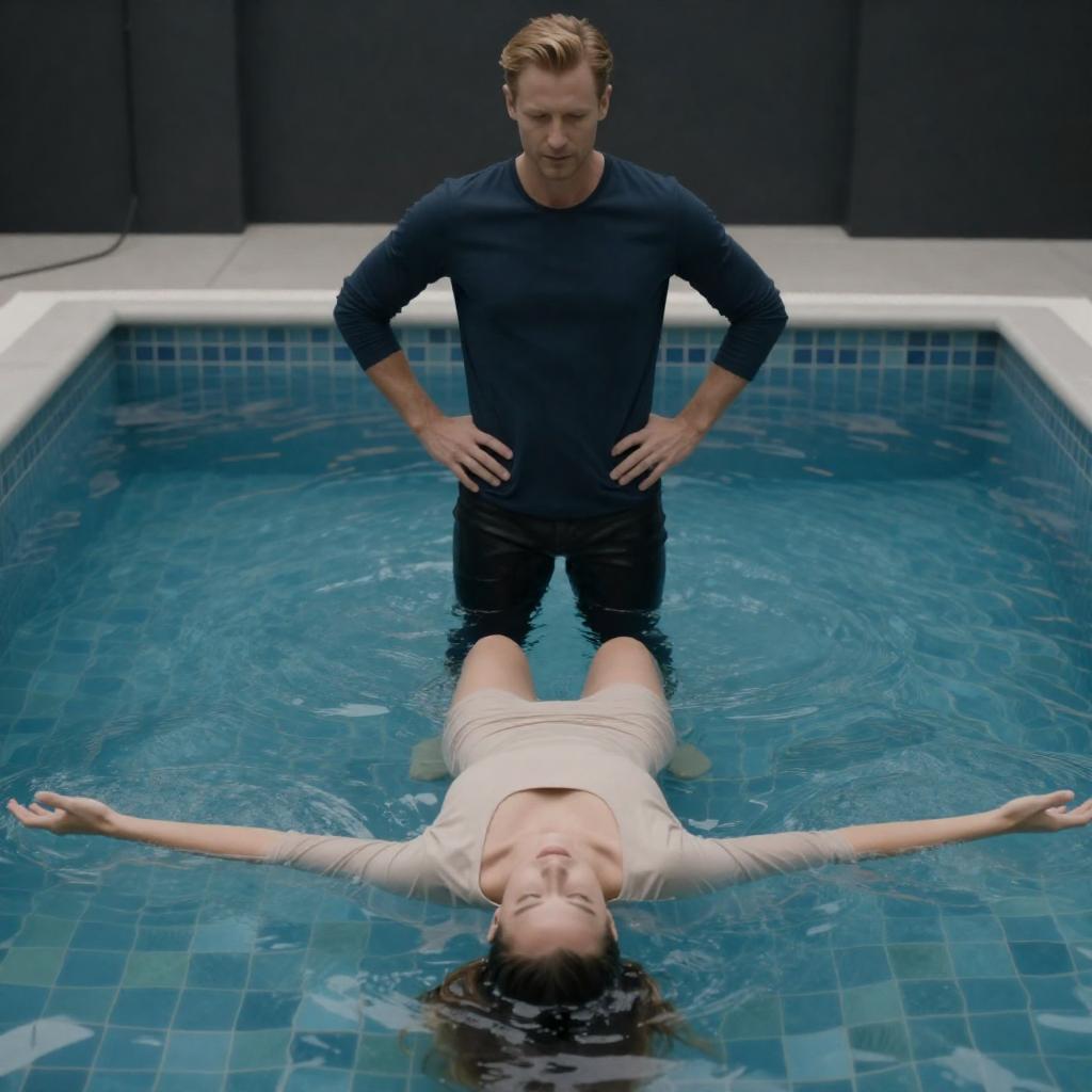 Photograph of a man with short blonde hair, wearing a navy blue shirt, gripping the neck of a woman with blonde hair, lying on a glowing white surface. The woman wears a white top and blue arm brace. The background is dark with electronic equipment. The man's expression is intense, and the woman appears unconscious.