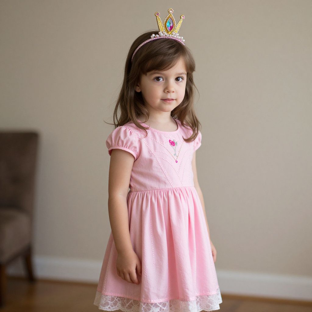 A child is wearing a red and white striped outfit with a flower headband.