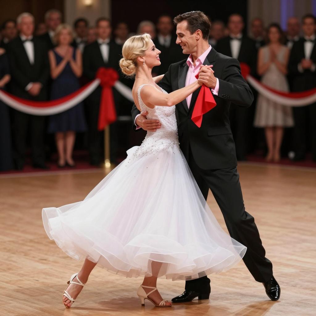 Couple dancing on a wooden dance floor. Woman in a white, sleeveless, ball gown with a large skirt and white ankle straps, blonde hair, smiling, holding a red handkerchief. Man in a black suit, pink shirt, black shoes, dark hair, smiling, holding red handkerchief. Background: blurred crowd in formal attire, decorated with red and white ribbons.