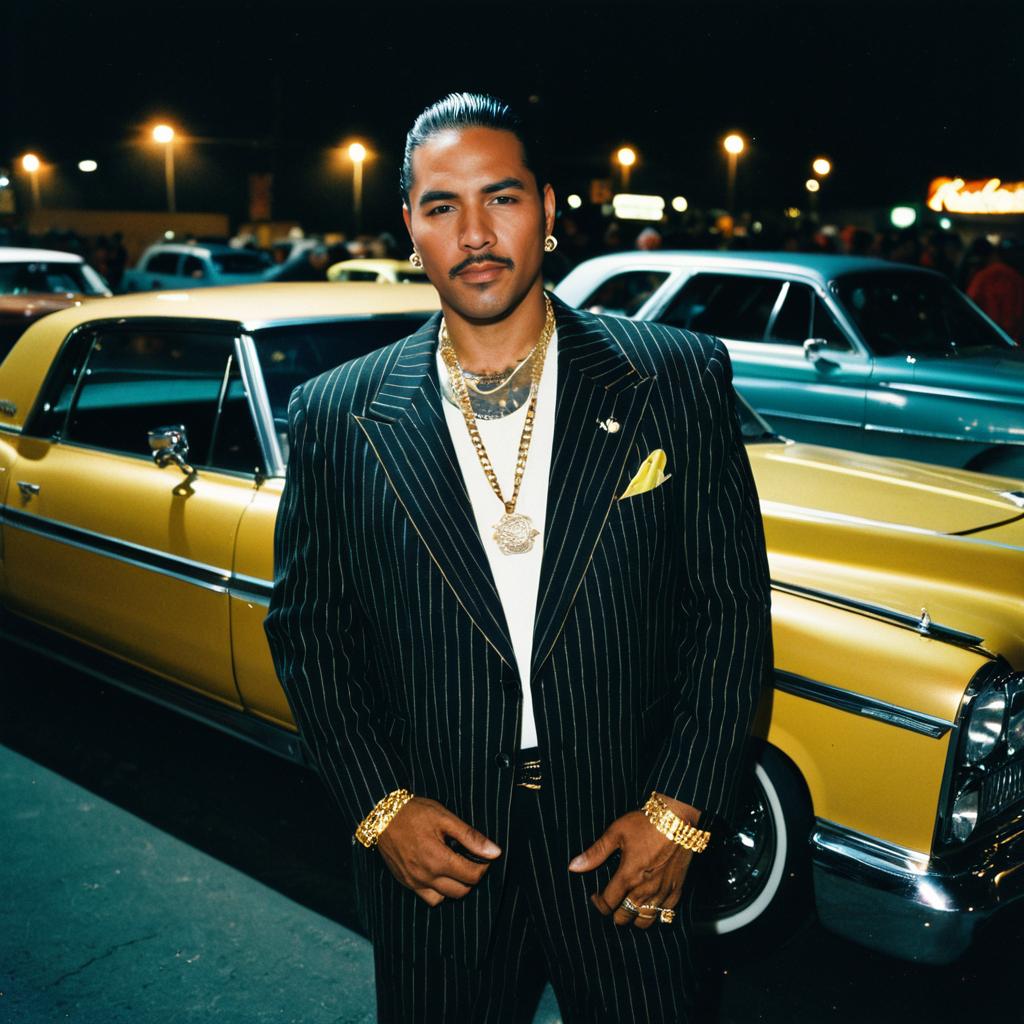 Sassy and trashy photograph of a lowrider car club elder, sporting flashy gold chains, faded pinstripe suit, slicked-back hair, leaning on a customized lowrider at a neon-lit urban car meet, cinematic film still, Kodak Portra, bold and provocative vibe.