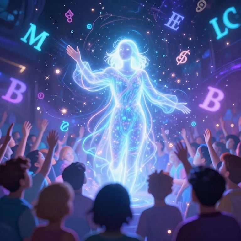 Eloquence portrayed as a mystical glowing figure speaking to a captivated ethereal crowd, surrounded by floating words and symbols, vibrant colors of blues and purples, dynamic magical atmosphere, surreal and inspiring fantasy art style