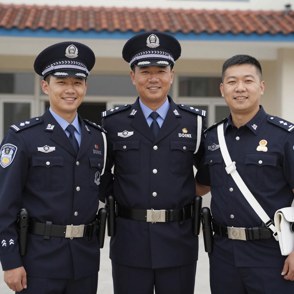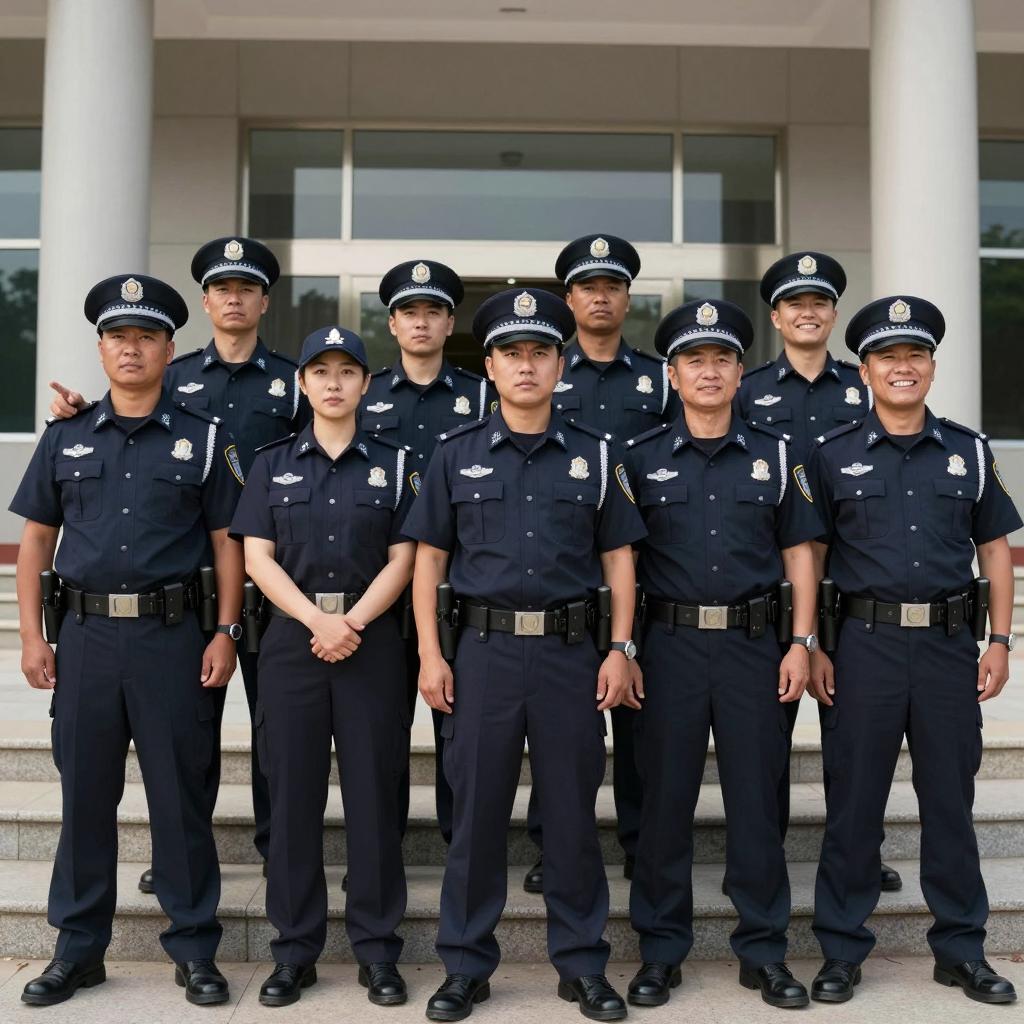 Photograph of twelve police officers in dark blue uniforms with blue hats, standing in front of a building with columns. They are in various poses, some with arms around each other, some pointing. Five men and seven women. Expressions are neutral to mildly expressive. Officer in front center has raised eyebrows. Officer on the right has a wide grin. Background includes building entrance with large windows.