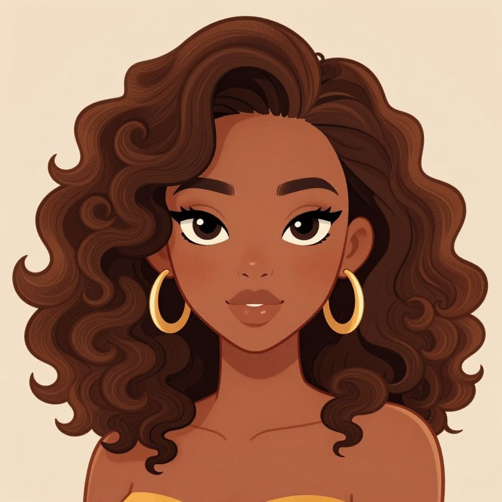 The image features a beautifully detailed, cartoon-style illustration of a woman with caramel brown skin. Her large, voluminous curls frame her face, cascading in intricate, spiral patterns that add a sense of depth and texture. Her symmetrical features are accentuated with a soft, glowing skin tone, highlighting her full lips and expressive eyes. She wears elegant, gold hoop earrings that complement her sophisticated look. The background is a warm, neutral shade, allowing the woman's vibrant hair and skin to stand out prominently. The overall composition is balanced, with the woman's face and hair occupying the central focus, creating a harmonious and visually appealing image.