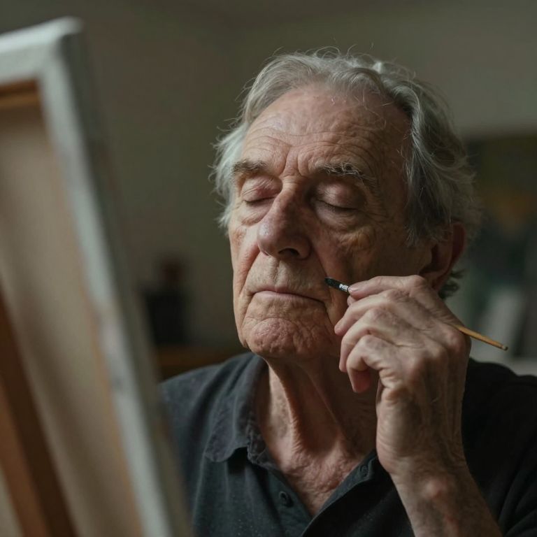 Envision an elderly portrait artist, serene and mysterious as they paint with eyes closed. From a first-person perspective, capture their intricate facial expressions, guiding intuitive brushstrokes across the canvas. Their eyelids flutter softly, illuminating the dimly lit studio. Soft highlights grace the subject's nostalgic skin, emphasizing life's etchings on their face and subtle emotions in this intimate artist-creation moment.