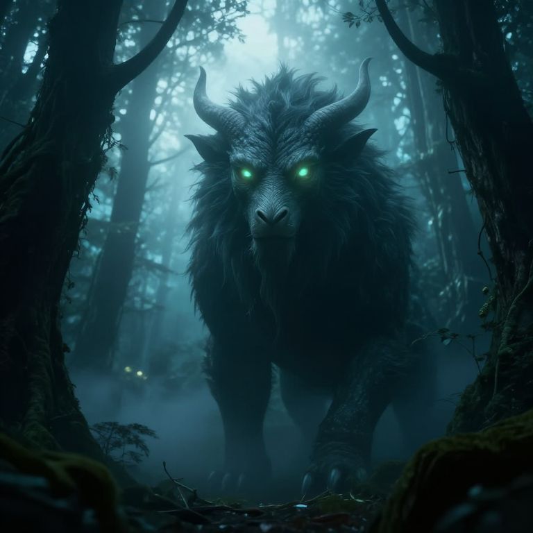 Digital fantasy artwork of a menacing, dark-furred, horned beast with glowing green eyes standing in a dense, misty forest. The creature's fur is shaggy and textured, with prominent, curved horns on its head. The forest is dimly lit with tall, shadowy trees and thick underbrush. A faint, eerie light filters through the mist, highlighting the creature's glowing eyes. The overall color palette is dark blue and black, creating a mysterious and foreboding atmosphere. The background features blurred, glowing green eyes in the distance, adding to the sense of lurking threats.