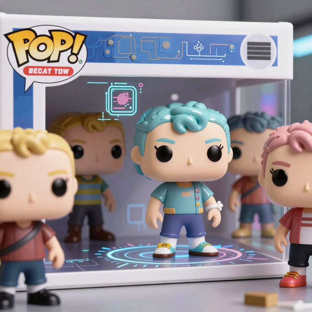 Photograph of Pop! figures in a futuristic holographic display with "Pop! Ecay Toy" logo, featuring characters with colorful hair and outfits.