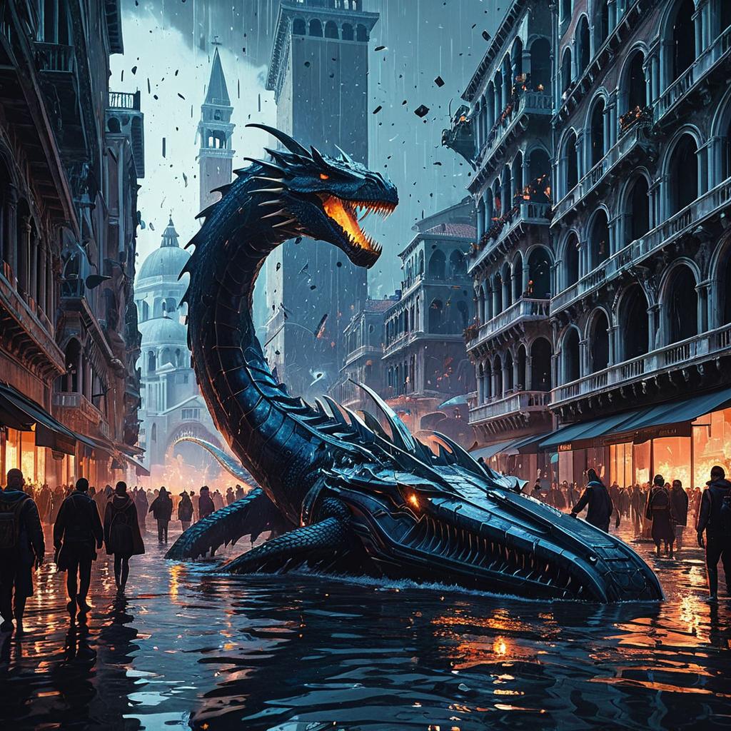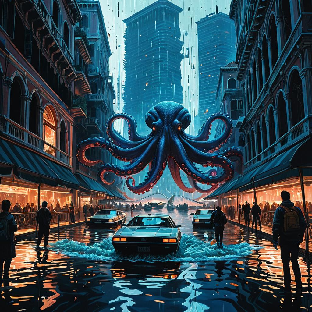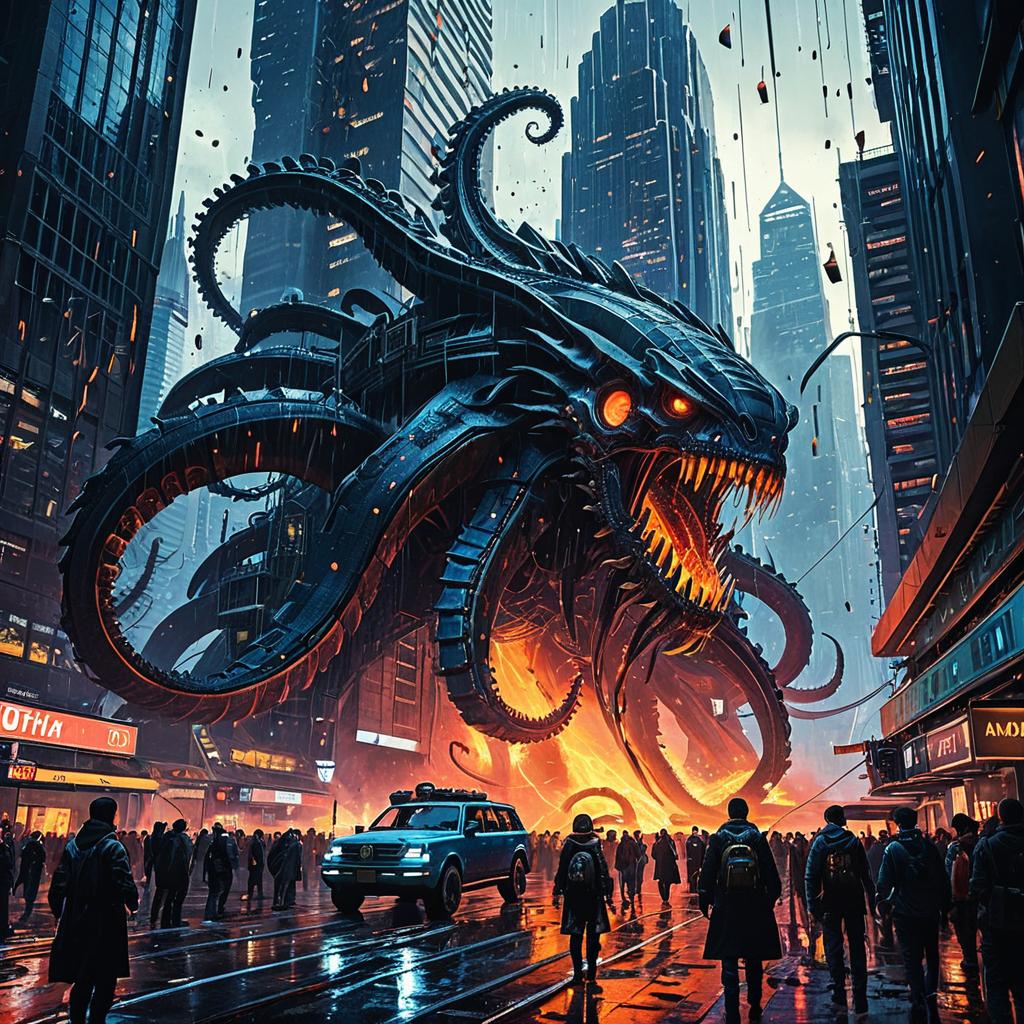 Hyperrealistic digital artwork depicting a gigantic bioluminescent kraken attacking a futuristic underwater city. Neon plasma and swirling embers illuminate the glass skyscrapers as frantic crowds gather in the rain-soaked streets. The composition features cinematic volumetric lighting, intricate textures, and matte painting style reminiscent of Zdzisław Beksiński and Feng Zhu. Created in 8K resolution with dynamic composition, this scene reflects chaos and sci-fi fantasy themes.