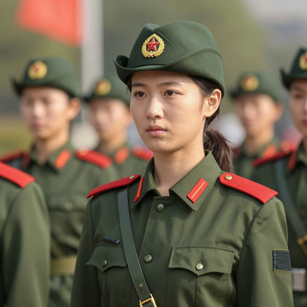 Military costume girl, photo of young Asian woman in military uniform, green jacket with red accents, black hat with emblem, serious expression, braid hairstyle, daylight outdoor setting, blurred green and orange background, realistic, high detail, slightly warm lighting