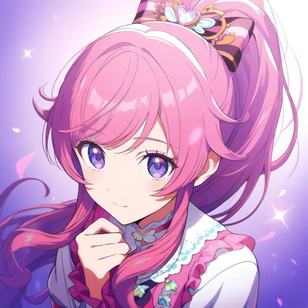Momoyama mirai, pretty series, 1girl, blue eyes, purple eyes, pink hair, long hair, sidelocks, ponytail, high ponytail, hair bow, by artist kaneko ryou, animagine