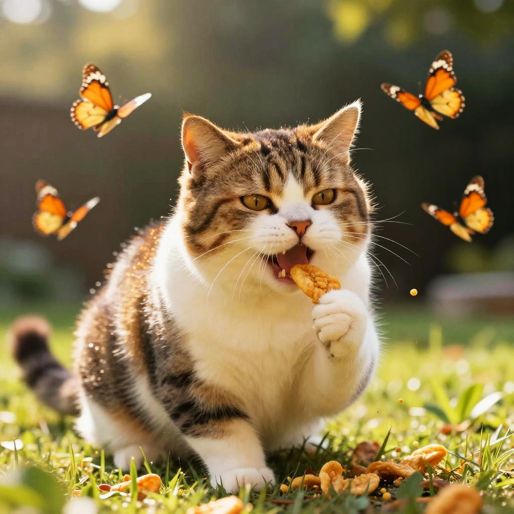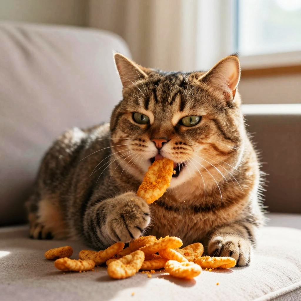Fat cat eating Cheetos on a retro diner table, neon lights reflecting off orange snack dust, expressive eyes wide with delight, detailed close-up of fur and texture, nostalgic and whimsical atmosphere.