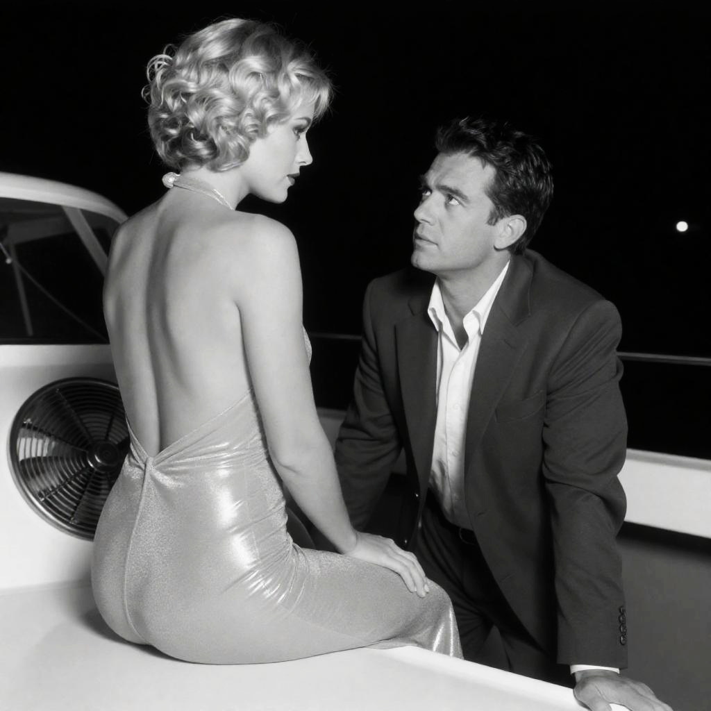 Black and white photograph of a man kneeling and looking up at a blonde woman with short, curled hair. She sits on a boat's edge, wearing a shiny, backless, halter-neck dress. The man's dark jacket contrasts with her light dress. Background is dark. Boat elements include a large fan and white railings. Woman's expression is downward and contemplative. Man's expression is intense and admiring.
