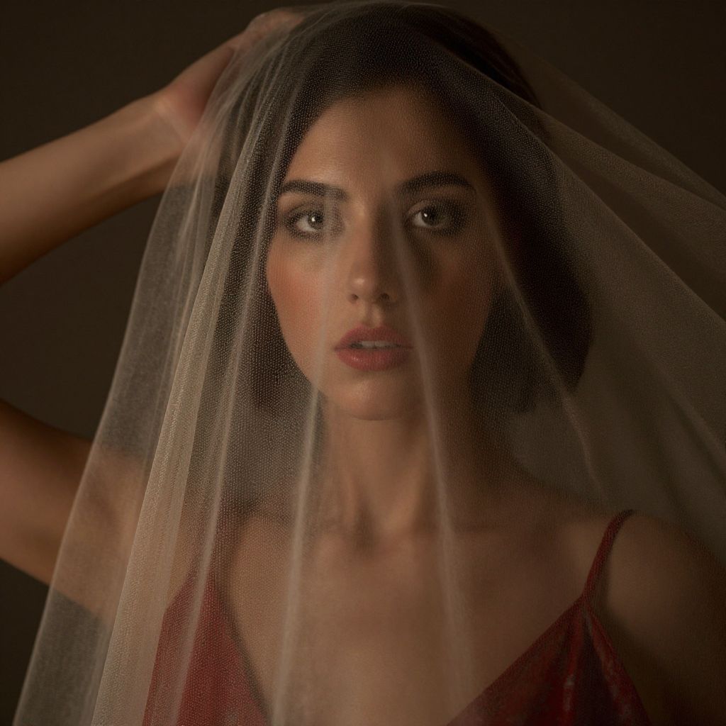 Enveloped in the soft glow of vintage elegance, a woman's poised silhouette whispers of hidden desires and untold secrets, her gaze piercing through the veil of mystery like a quiet storm brewing beneath the surface.