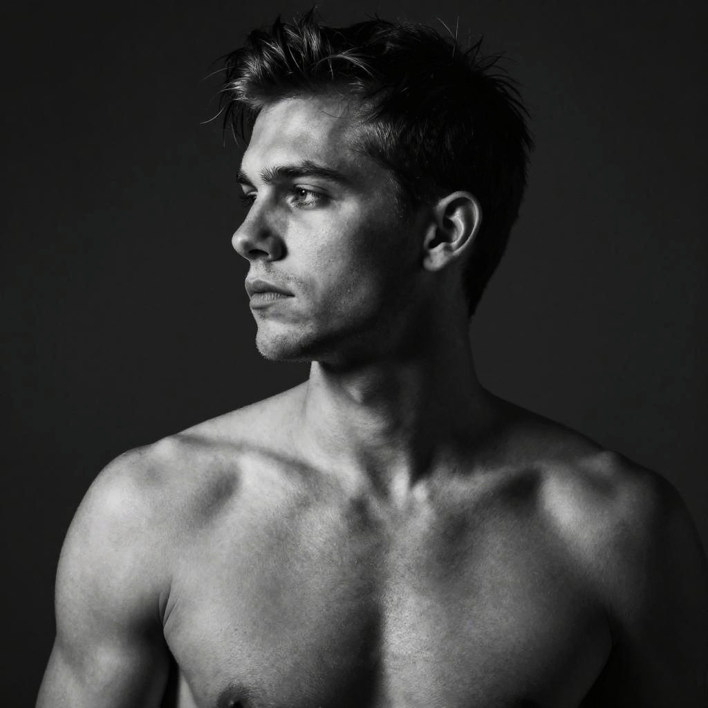 Justin Watson shirtless, artistic black and white portrait, moody shadows, close-up profile, expressive and powerful composition, high contrast, studio photography style
