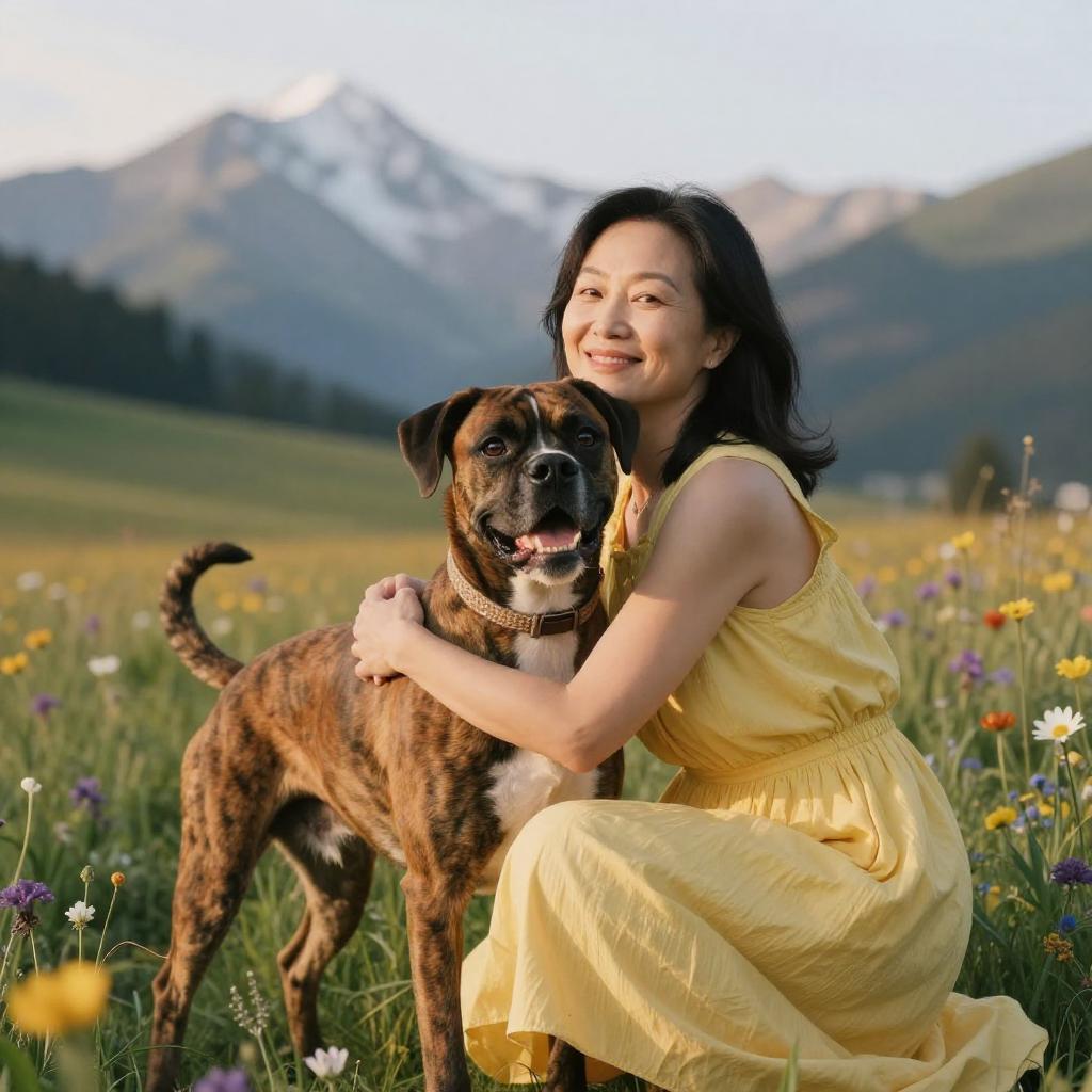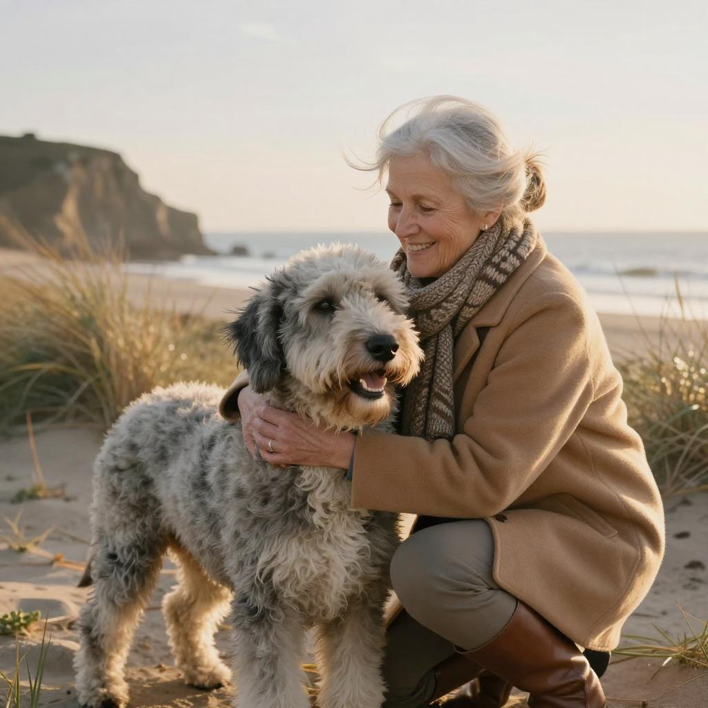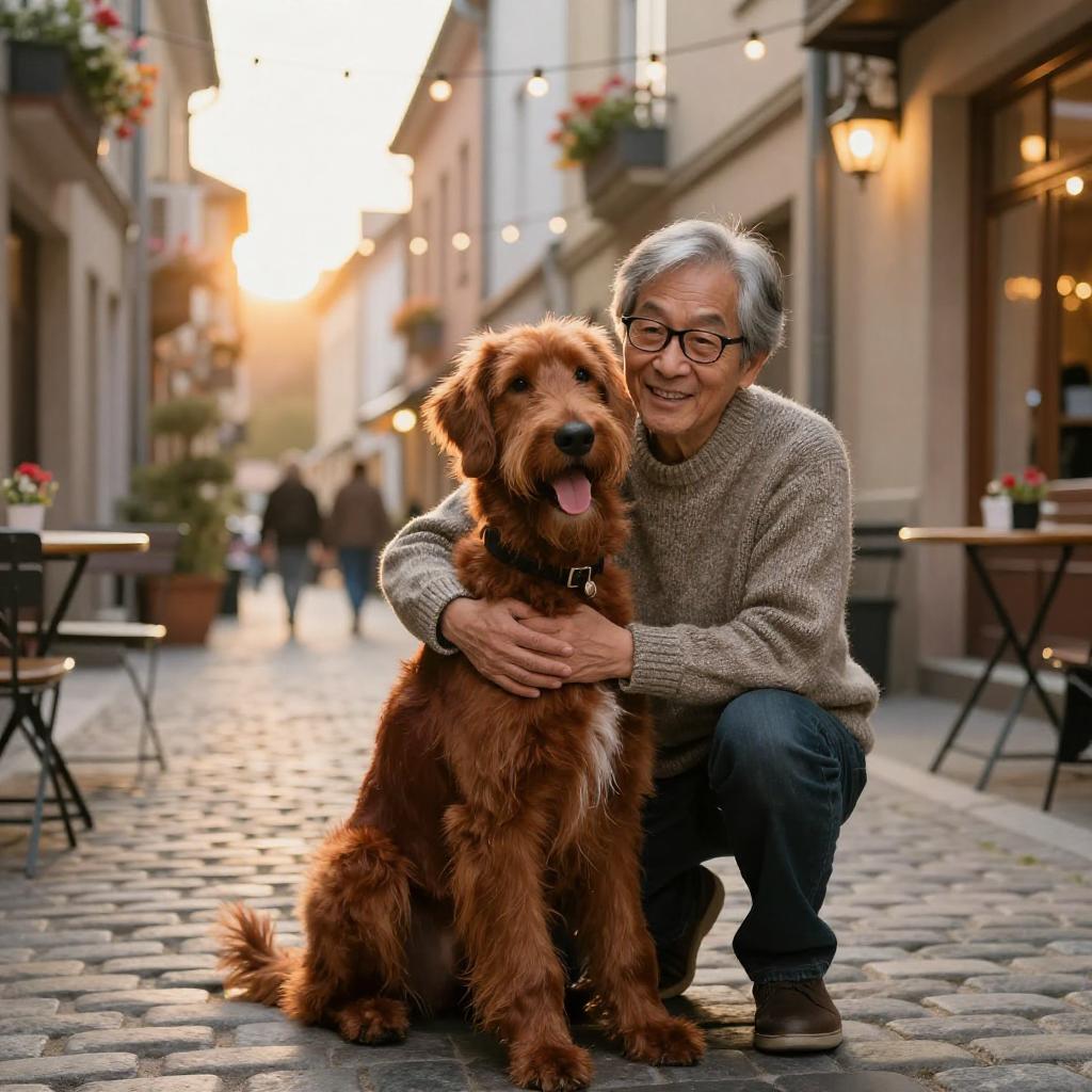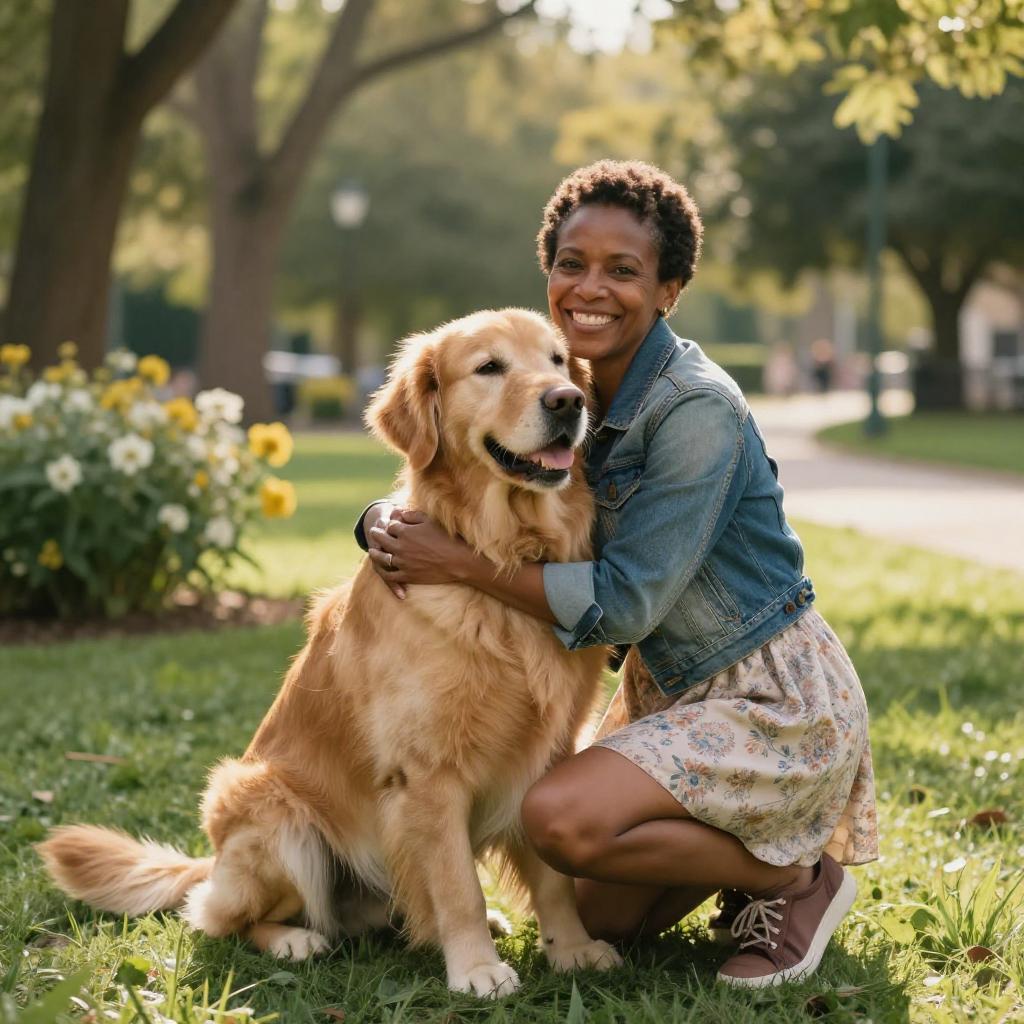 Cheerful elderly woman with short silver hair wearing a cable-knit cream sweater and high-waisted denim trousers, warm smile kneels or sits, hugging medium golden retriever with slightly wavy sunlit golden fur, soft ears and gentle brown eyes, sun-dappled community garden with raised wooden beds, string lights and potted herbs in the background, warm natural light, golden hour glow, joyful and affectionate atmosphere, photorealistic, shallow depth of field, soft bokeh, natural colors, subtle film grain, 85mm lens look, crisp textures, clean composition, SDXL