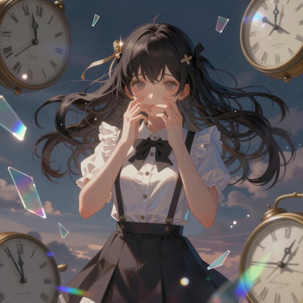 Digital illustration of a young anime girl with long flowing black hair decorated with ribbons and hair ornaments. She is wearing a white blouse with frills and a black bowtie, paired with black suspenders and a pleated skirt. Surrounded by large floating antique clocks and fragmented glass pieces showing colorful refractions. The scene features cinematic lighting, dynamic angles, and a detailed, colorful sky with sharp focus and intense dark shadows.