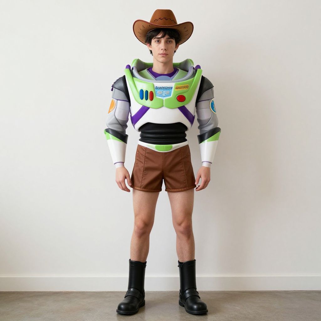 "lightyear sox costume, male focus, 1boy, solo, hat, full body, standing, shoes, black hair, arms at sides, socks, black footwear, looking at viewer, shorts, brown shorts, closed mouth, jacket, long sleeves, cowboy hat Realistic photo of casual sexy person with pretty face"