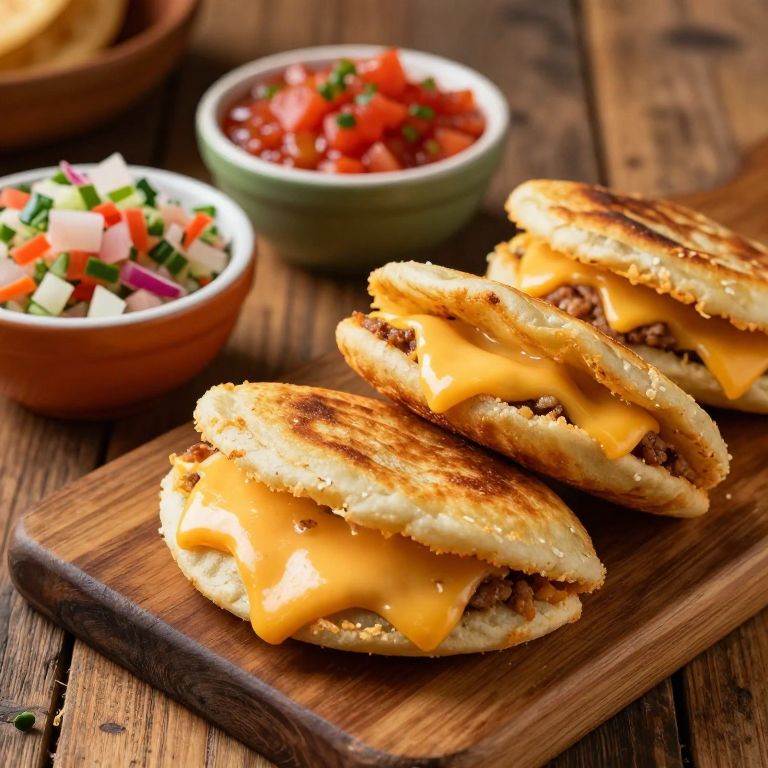 Pupusas fresh from the comal, golden and crispy, with steaming melted cheese oozing out, surrounded by vibrant bowls of curtido and salsa roja, rustic wooden table setting, warm natural light highlighting textures, traditional Salvadoran food scene