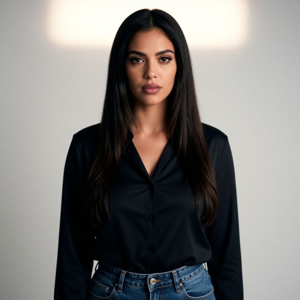 Photograph of a young woman with long, straight, dark brown hair and medium brown skin standing against a plain white background. She has dark eyes, well-groomed eyebrows, and is wearing subtle makeup with a pinkish lip color. She is dressed in a black, long-sleeved, button-up shirt with a V-neck and high-waisted blue denim jeans. The lighting is bright, coming from above and behind her, creating a soft halo effect around her head. The image has a professional, studio-quality feel.