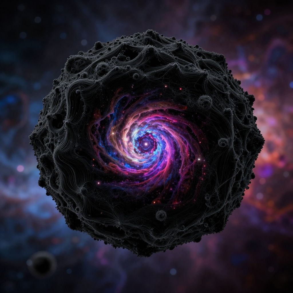 A digital CGI image showcasing a swirling black, fractal-like sphere at its center, surrounded by a vibrant, colorful galaxy with pink, purple, and blue hues. The sphere's intricate, lace-like texture contrasts with the cosmic background, which features scattered stars and nebulae. The spiral at the sphere's core glows brightly, drawing the eye inward. The overall composition evokes a sense of cosmic wonder and complexity, blending the dark, detailed texture of the sphere with the dynamic, luminous colors of the galaxy.