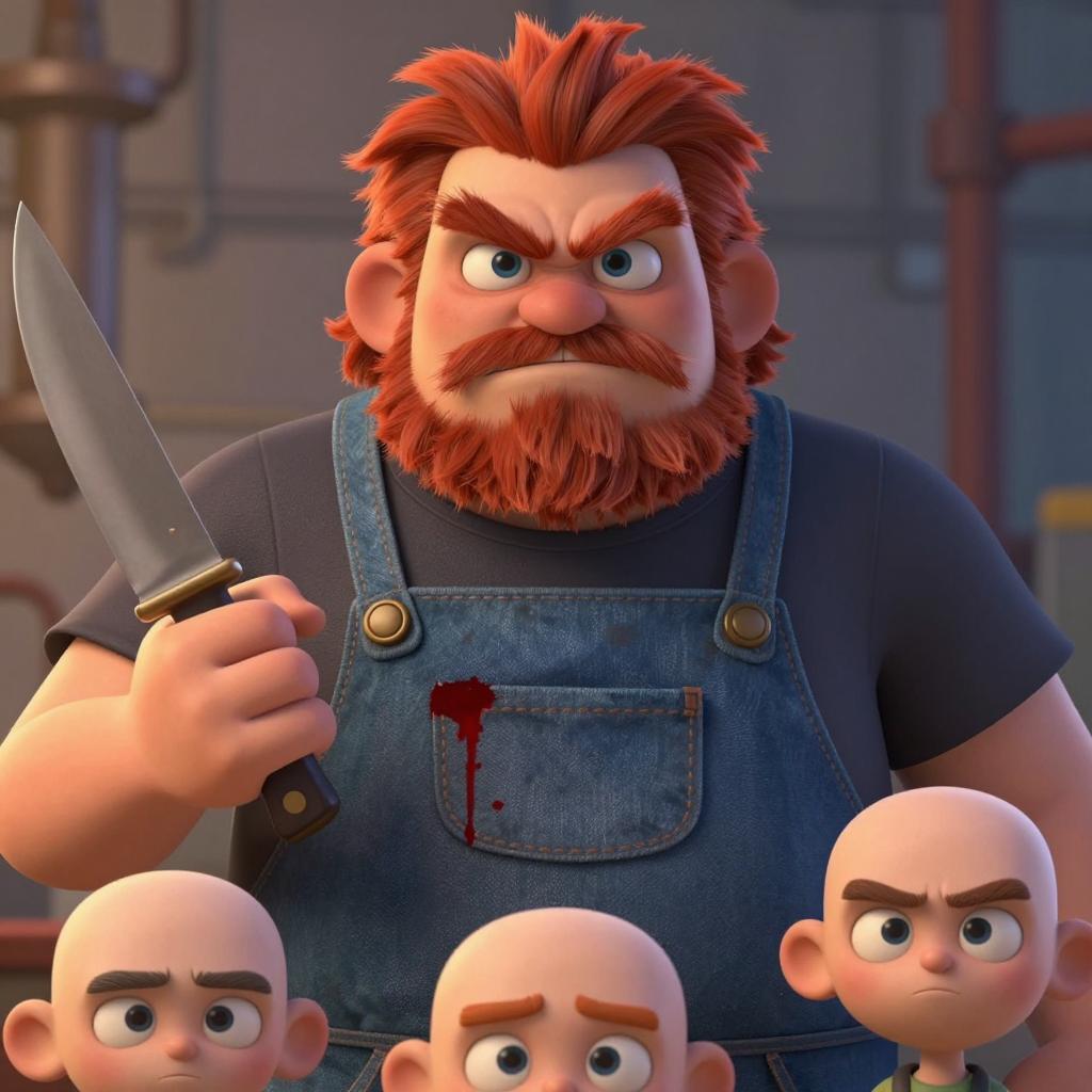 Illustration of a large, menacing, animated character with red hair, blue eyes, and a beard, wearing a bloodstained blue denim apron, holding a knife in his right hand. Background shows a blurred industrial setting. Three small, bald, faceless figures stand in the foreground. Close-up of the character's angry face is in the bottom right. Bright, colorful, and highly detailed.