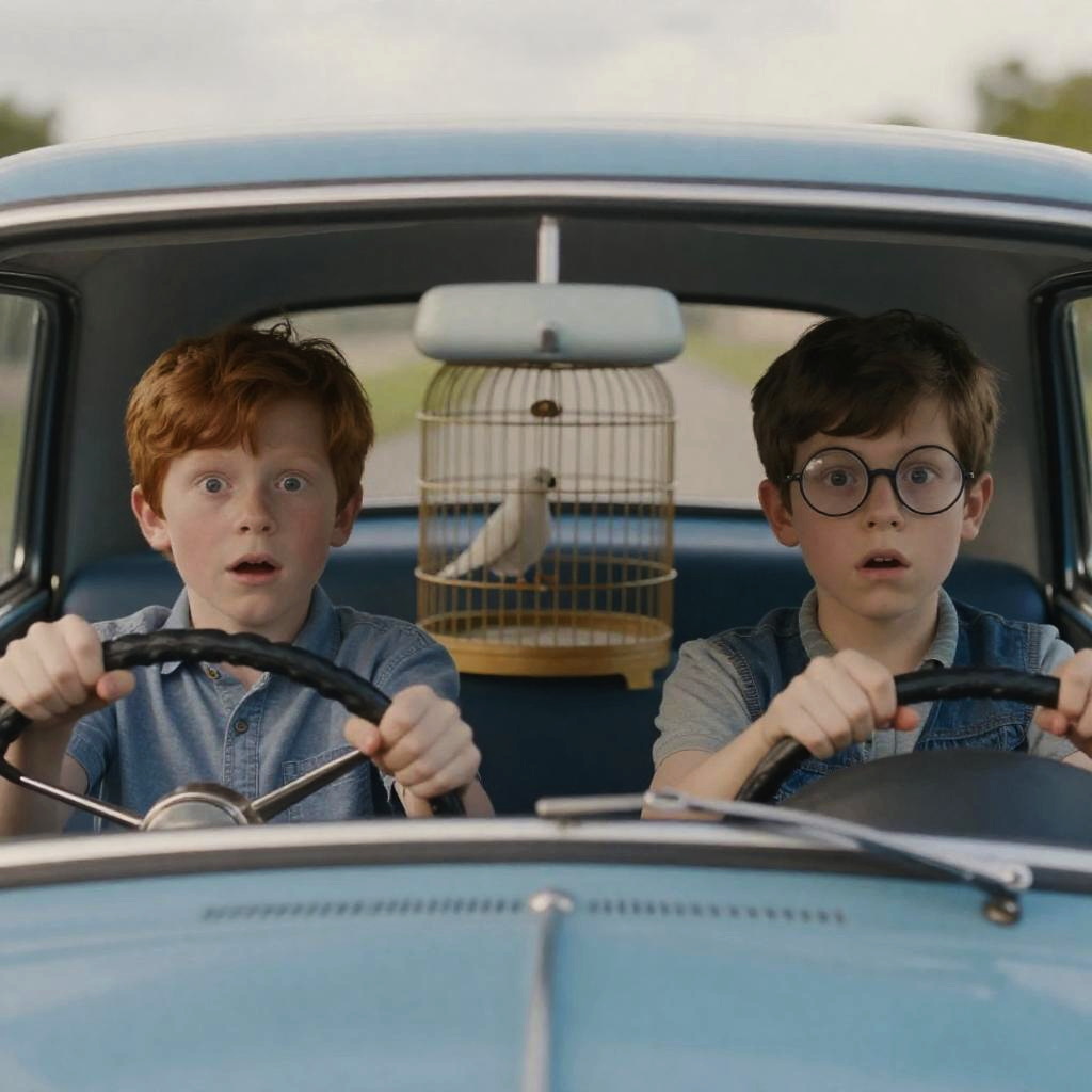 Photograph of two children in a vintage blue car. Red-haired boy on left, round glasses, white shirt, looking ahead. Brown-haired boy on right, red plaid shirt, glasses, surprised expression. Birdcage between them, mountains in background. Both hands on steering wheel. Clear sky with clouds.