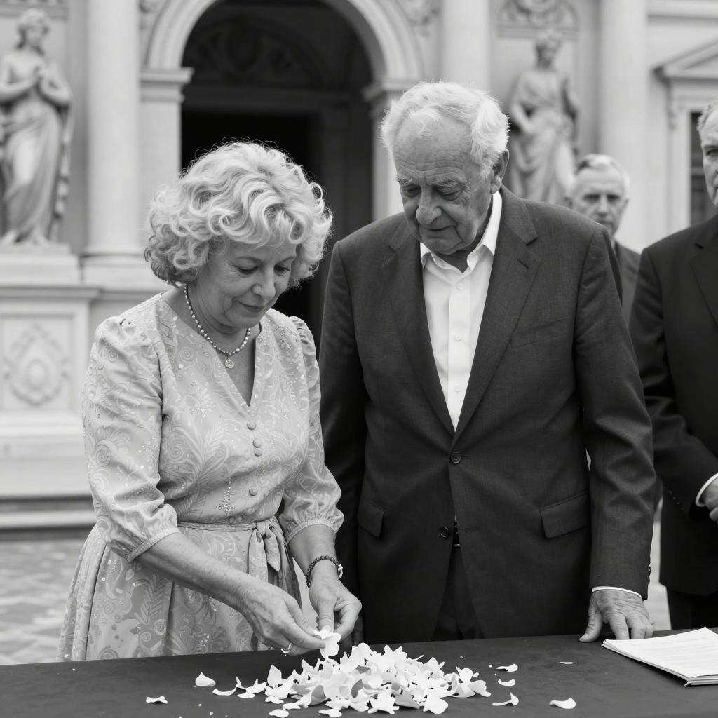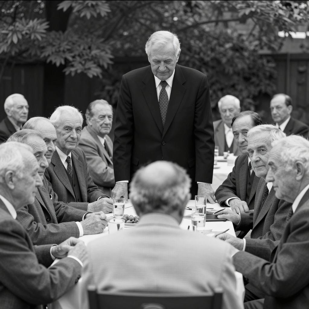 Black-and-white photograph of a group of elderly men seated around a table in an outdoor setting. A tall man in a dark suit stands at the head, looking down. Other men have varying expressions, some smiling. Background includes trees and chairs. Visible table and glass objects in foreground. 12 people total.